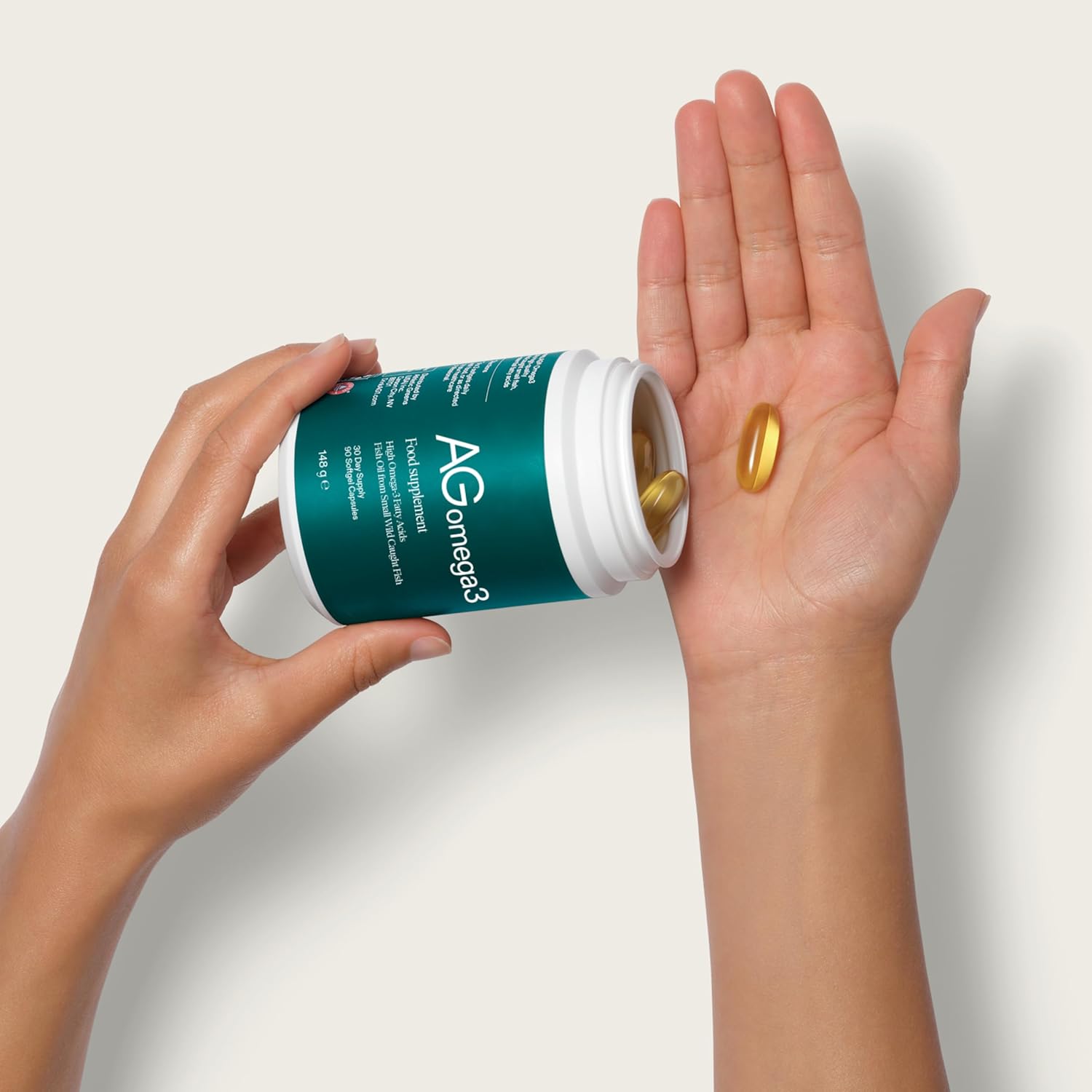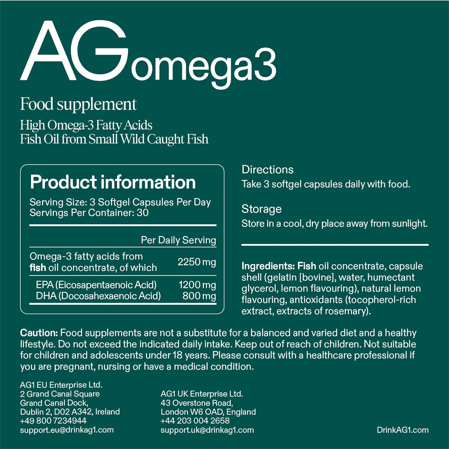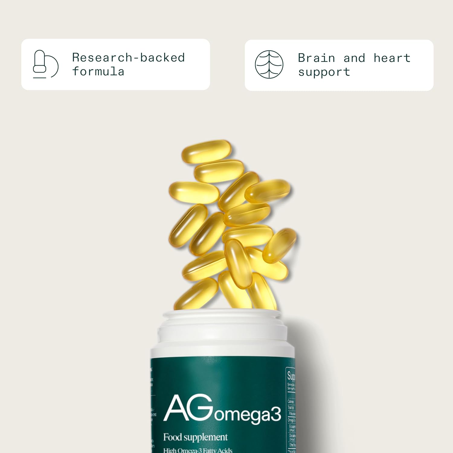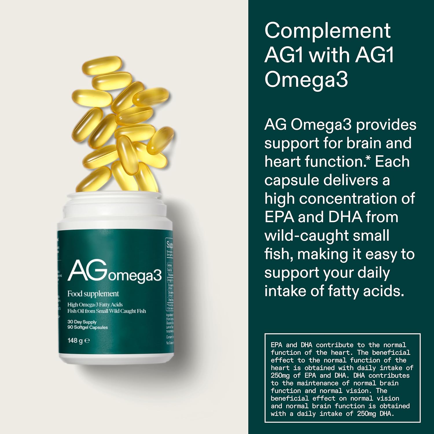 - AG OMEGA3: Complements AG1 by providing additional support for brain and heart function.* Each capsule delivers a high concentration of EPA and DHA from wild-caught small fish, making it easy to support your daily intake of fatty acids.