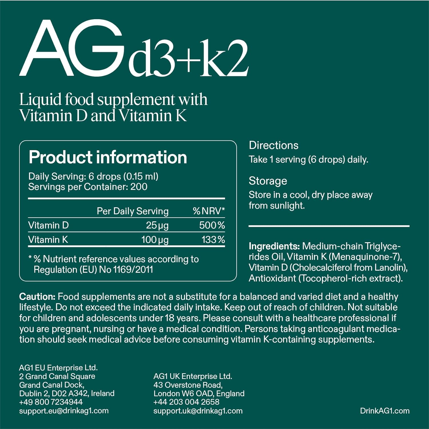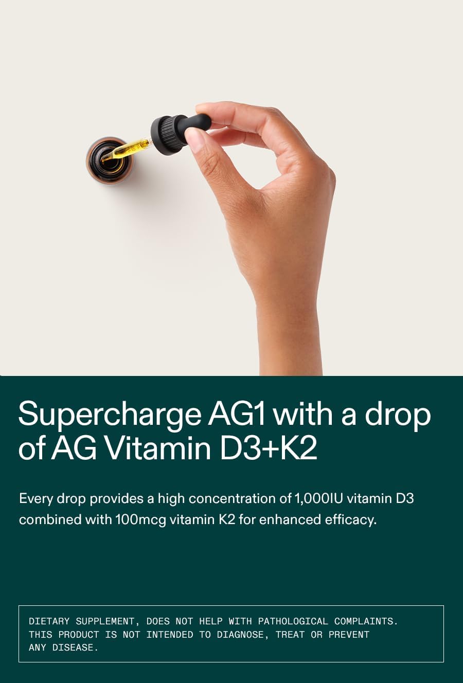 - AG VITAMIN D3+K2: Complements AG1 by providing additional support for immune and bone health.* Every drop provides a high concentration of vitamin D3 combined with vitamin K2 for enhanced efficacy.