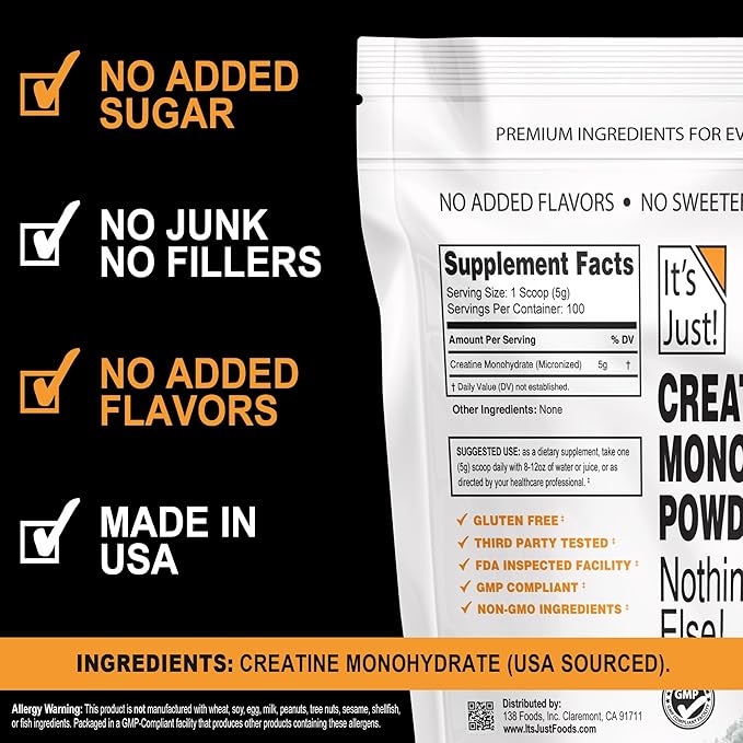 It's Just! - Creatine Monohydrate Powder, Pure Creatine Powder, Made in USA, 3rd Party Lab Tested, 5g Per Serving, Scoop Included, No Fillers, No Added Flavor (Unflavored, 500g / 100 Servings)